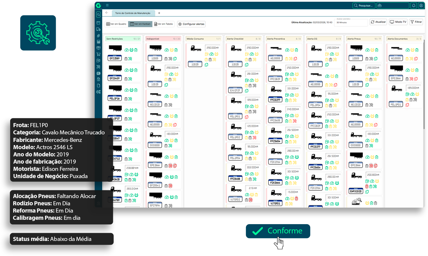 Manutenção planejada, alertas automáticos emaior disponibilidade da frota.